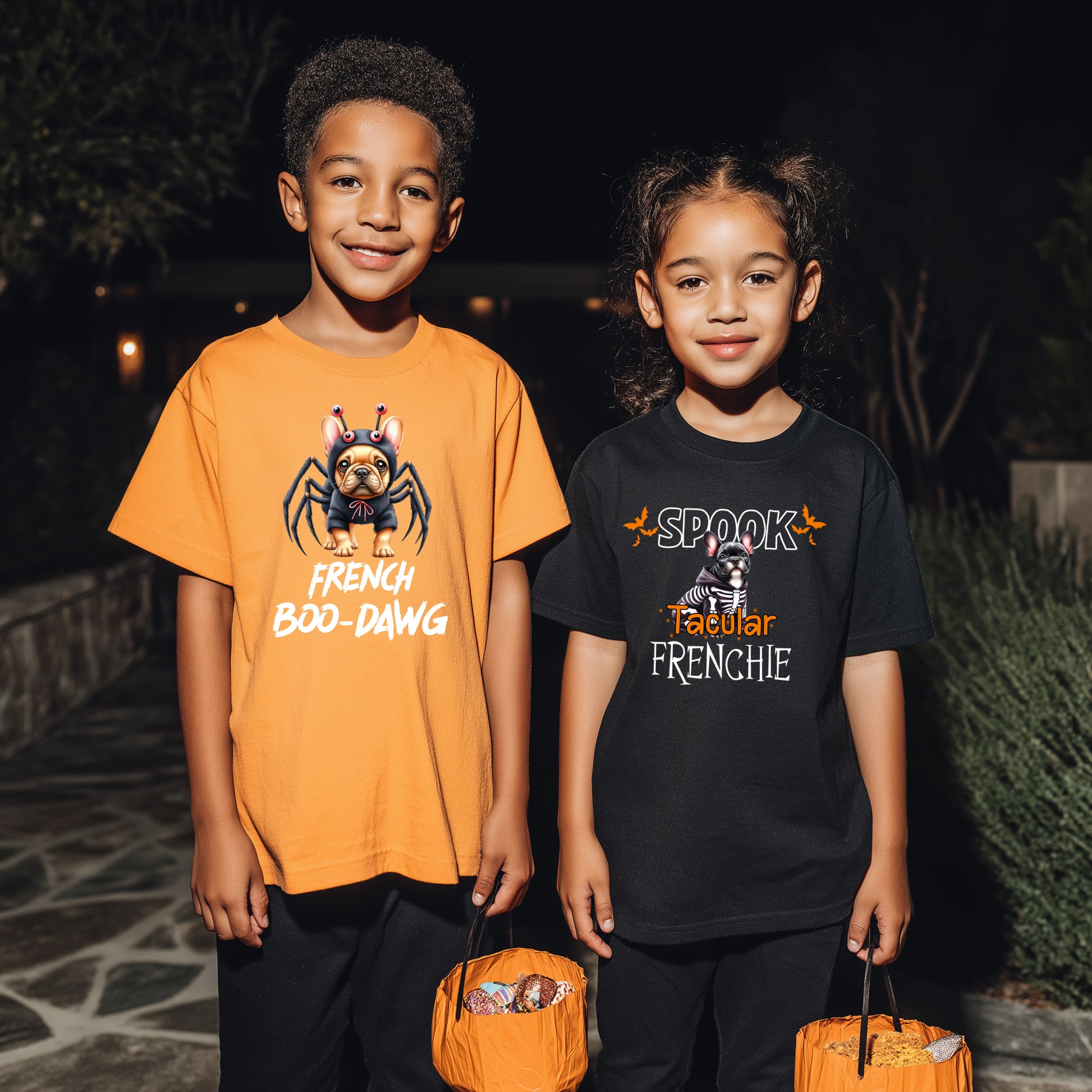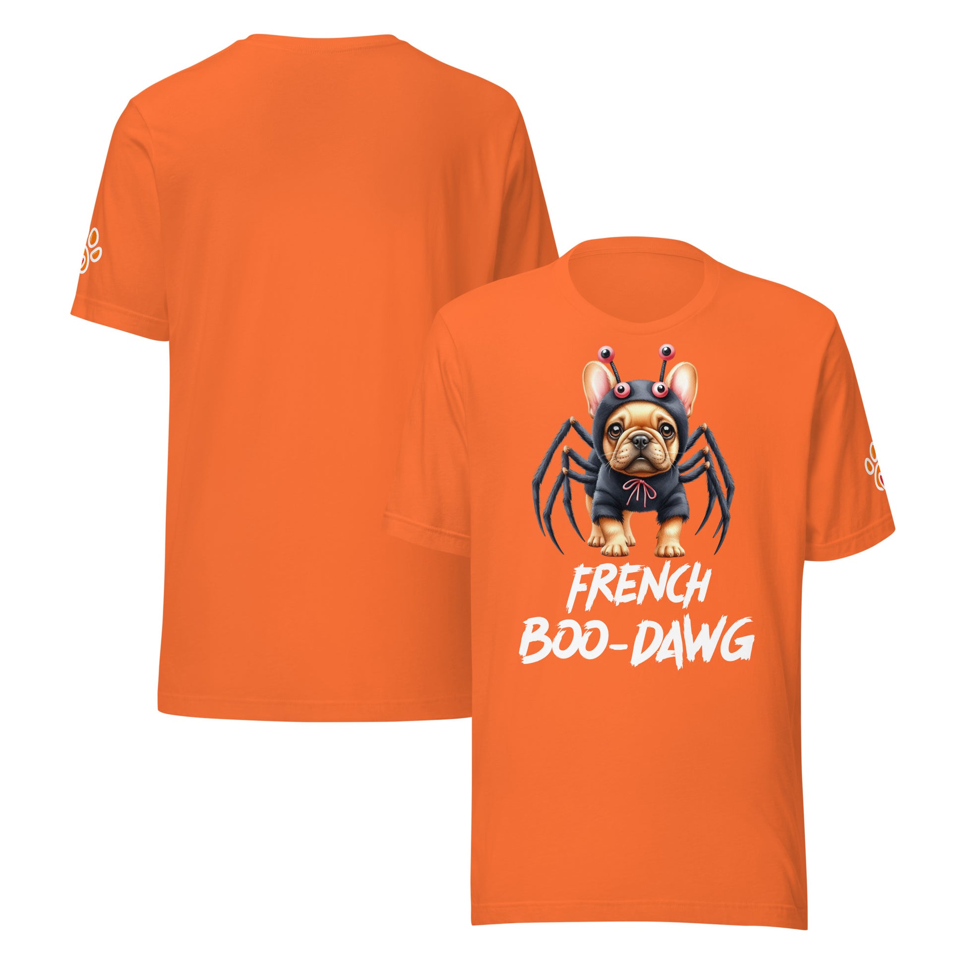 Get ready for cuteness overload! Our "French Boo Dawg" tee features an irresistibly adorable French Bulldog rocking a fuzzy spider costume- complete with 8 wobbly legs and a mischievous glint in their eyes. This little Arachnid imp is ready to haunt your heart (not your house!)